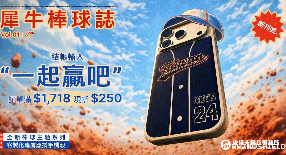 為了邀請全民共同為臺灣隊集氣,犀牛盾棒球主題系列已於官網全面上架,並同步祭出感人的回饋活動。即日起至 3 月 17 日止,只要在犀牛盾官網選購全站任何產品,單筆訂單金額滿 1,718 元,並於結帳時輸入專屬折扣碼「一起贏吧」,即可直接享有 250 元的現金折抵。