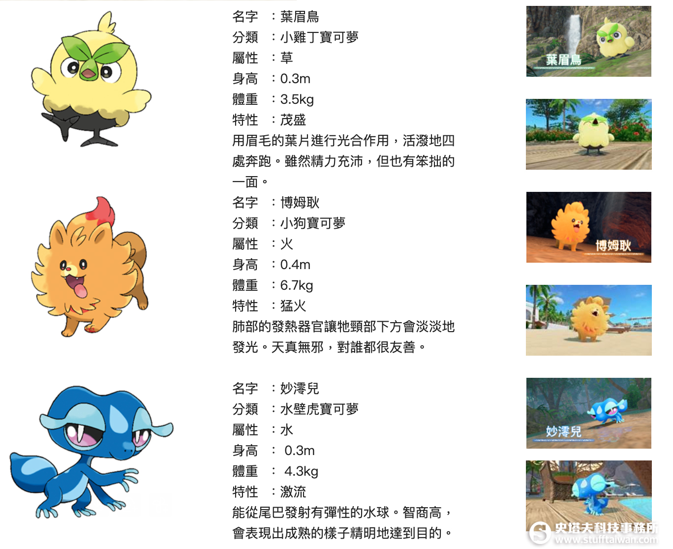 小雞丁寶可夢「葉眉鳥」、小狗寶可夢「博姆耿」、水壁虎寶可夢「妙澪兒」。從這3隻中選擇1隻成為夥伴的寶可夢,和牠一起展開新冒險吧。