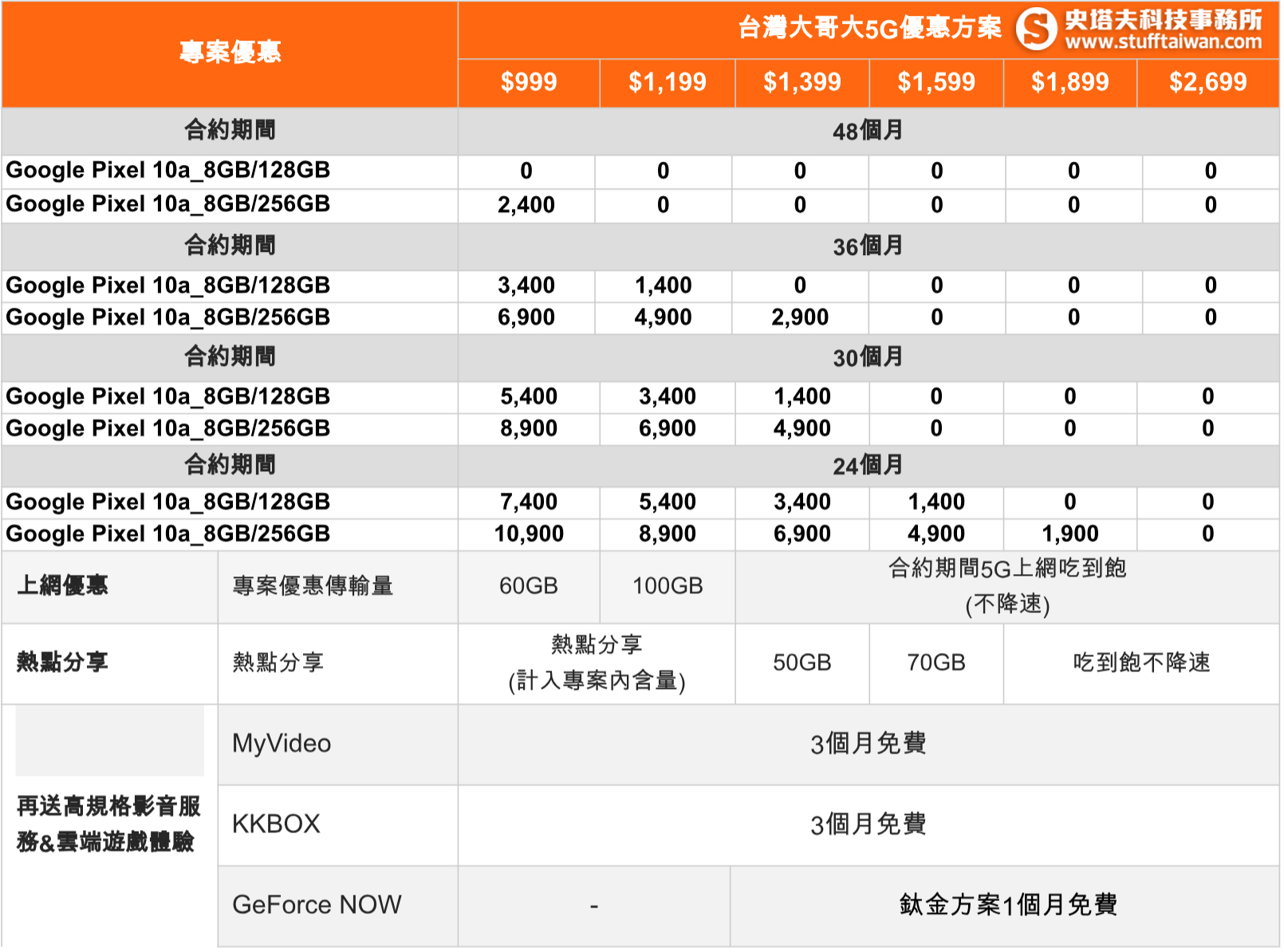 - 指定專案$0起帶走:係指申辦5G 1399資費專案,綁約36個月,並搭配Google Pixel 10a (8G/128G),手機專案價$0,部分專案須預繳。