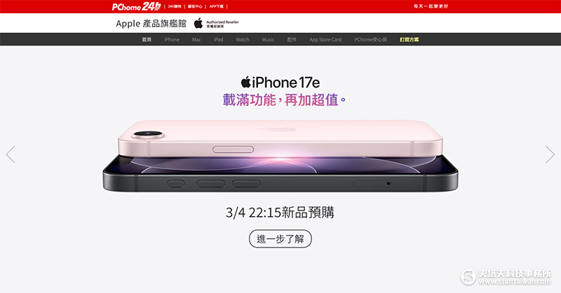 PChome 24h購物作為台灣電商唯一Apple全系列授權經銷商,將同步官方於 3/4(三) 22:15 於Apple旗艦館開放「iPhone 17e」系列新機全顏色、全規格預購。