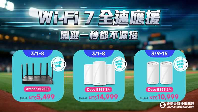 - 3月1日至3月8日期間,專為公寓小家庭設計的 Archer BE600 Wi-Fi7路由器限時下殺至 NT$5,499(原價 NT$5,999);針對大坪數、多隔間需求的 Deco BE65 (3-pack) Mesh Wi-Fi7系統 限時下殺 NT$14,999(原價 NT$16,999)