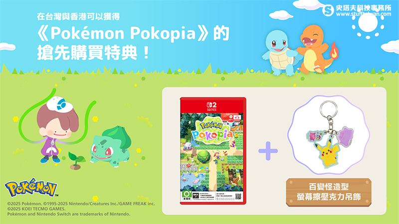 凡提前購買《Pokémon Pokopia》盒裝版遊戲,即可獲得「百變怪造型螢幕擦壓克力吊飾」一份。特典內含皮卡丘與百變怪壓克力吊飾,不僅可作為實用的螢幕清潔擦,也可為包包、錢包或隨身物品增添可愛裝飾。