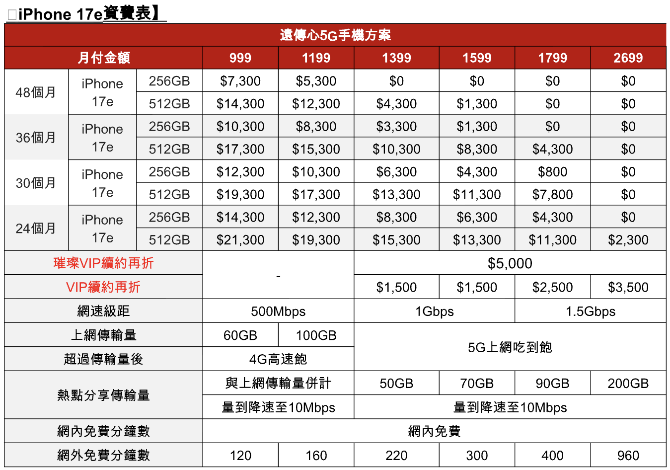 消費者只要申辦月付 1,399 元的指定方案,即可將 iPhone 17e 256GB 版本以 0 元帶回家;即便是直攻 512GB 大容量機款,專案入手價也低於 5,000 元。此外,遠傳更針對前 700 名登錄成功的早鳥用戶加碼贈送千元購物金,讓換機體驗更加物超所值。