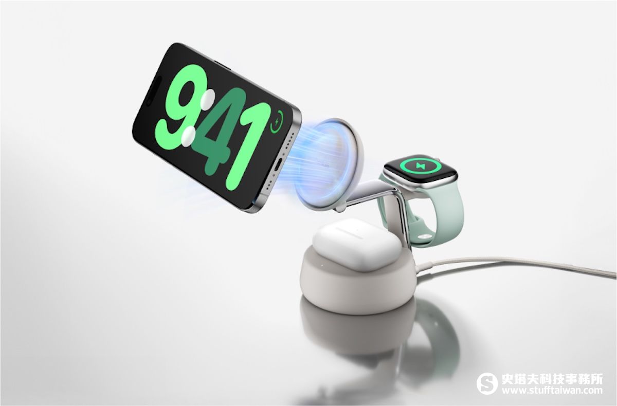 透過精準的磁吸定位與一機三用的設計,用戶能同步為 iPhone、Apple Watch 及 AirPods 補足電力,完美解決旅途過程或日常辦公桌面對於多裝置充電的繁雜需求。