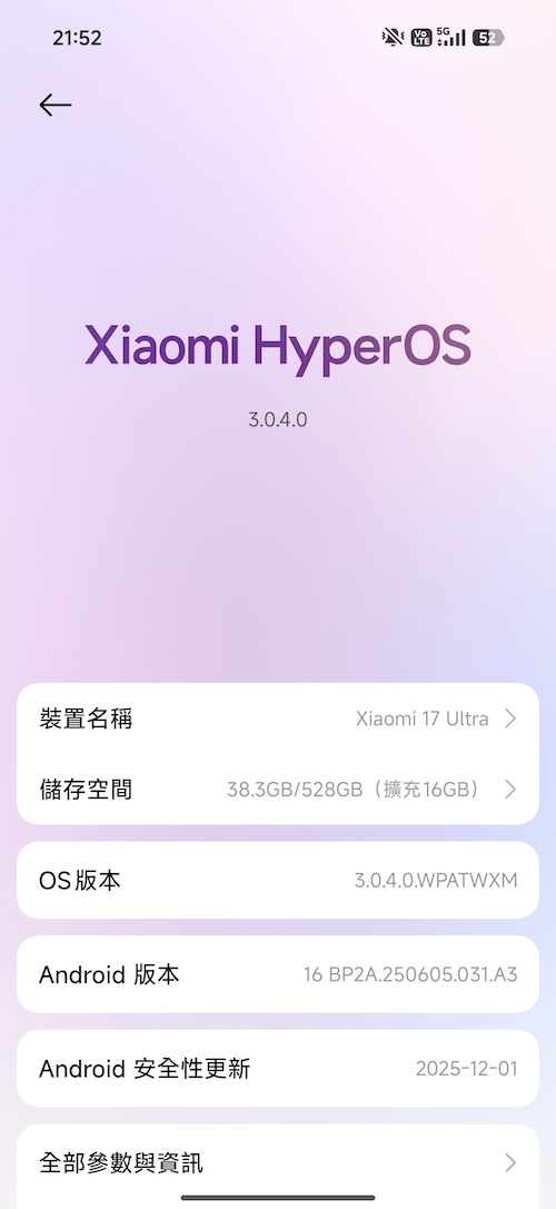Xiaomi 17 Ultra上市搭配Xiaomi HyperOS 3.0.4與Android 16,512GB版本實際約有490GB可用,最高支援16GB虛擬記憶體。
