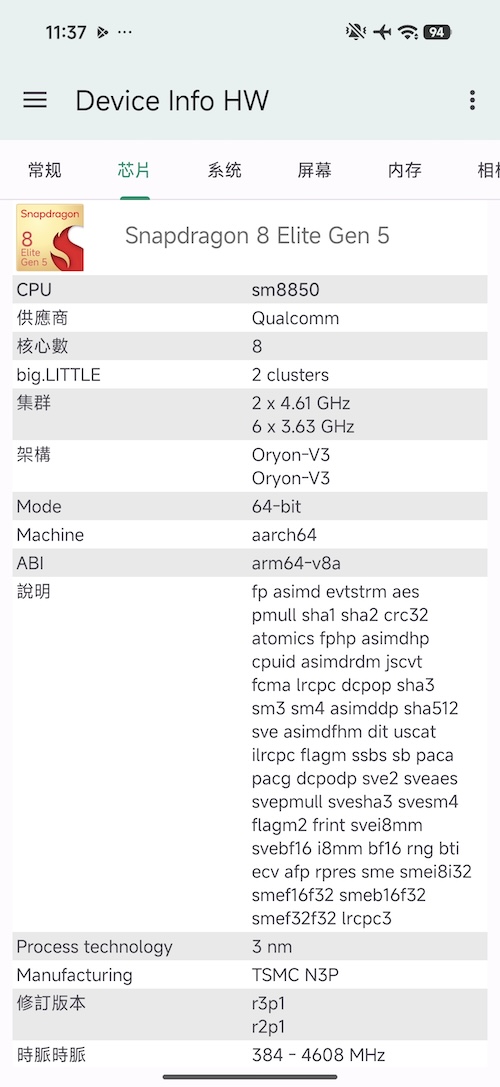 利用Device Info HW查詢硬體資訊,Snapdragon 8 Elite Gen 5的架構是雙核心4.61GHz+六核心3.63GHz。