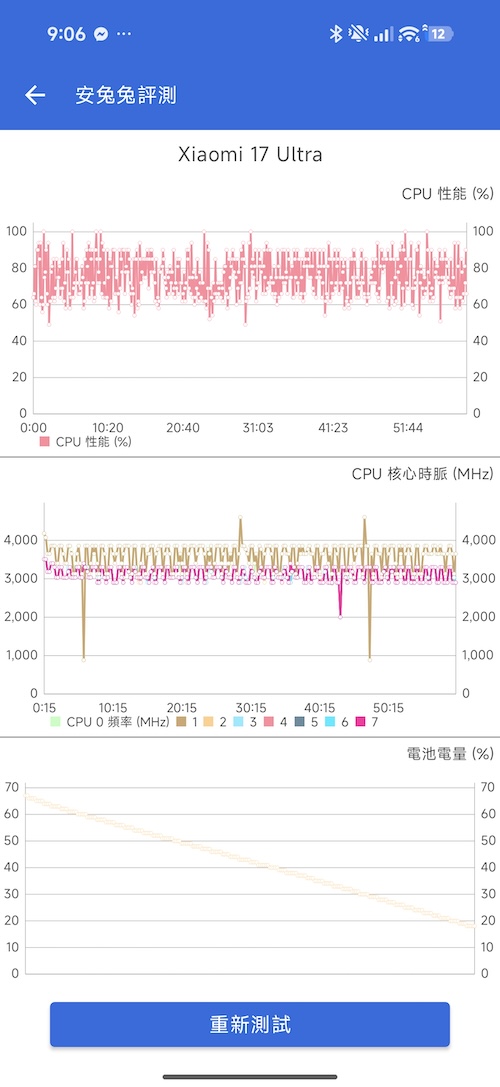 Xiaomi 17 Ultra跑安兔兔壓力測試1小時,CPU時脈上下波動比較明顯,期間電量從66%降至12%、溫度從29度最高到45度。