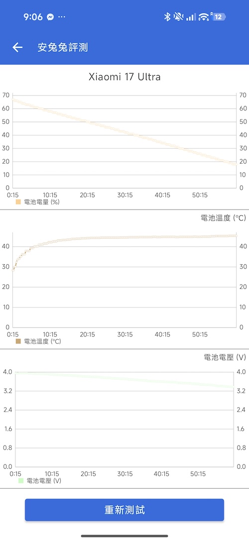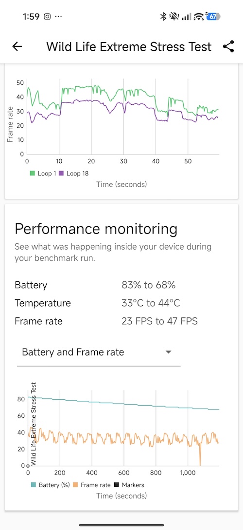 Xiaomi 17 Ultra跑3Dmark-Wild Life Extreme壓力測試20分鐘,穩定為79.4%還不錯,期間電量從83降至68%、溫度從33度上升到44度。