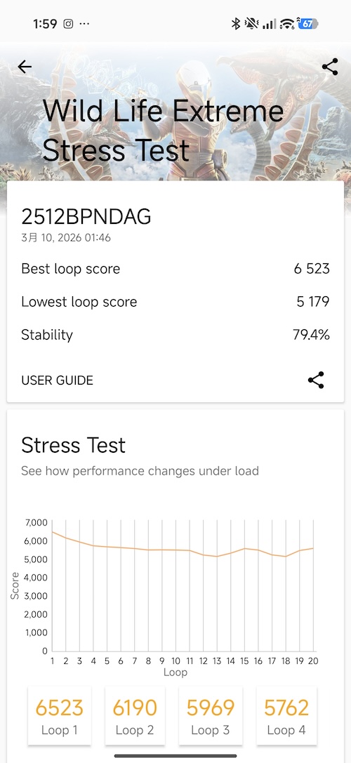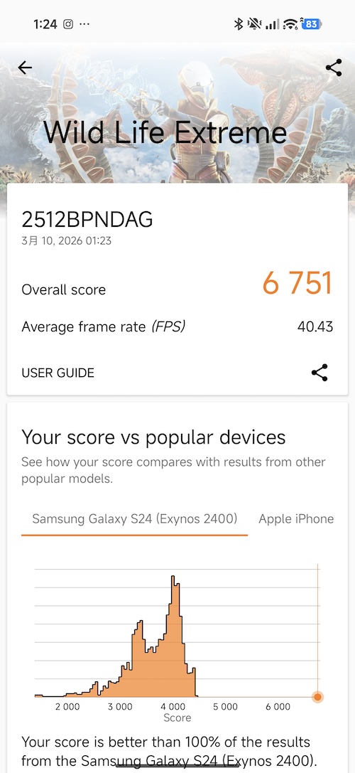 Xiaomi 17 Ultra跑圖形性能為主的3Dmark-Wild Life Extreme,得到6,751分。