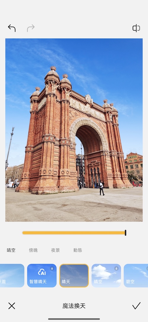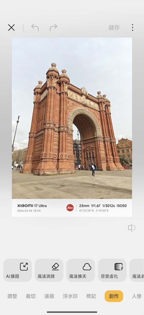 Xiaomi 17 Ultra在相簿中將AI功能都整合到了「創作」中,點進去可以看到AI擴圖、魔法消除(包括去人/去眩光/去反光)、魔法換天、背景虛化等。魔法換天是小米在AI還沒在手機上普遍應用時,早就有的功能。