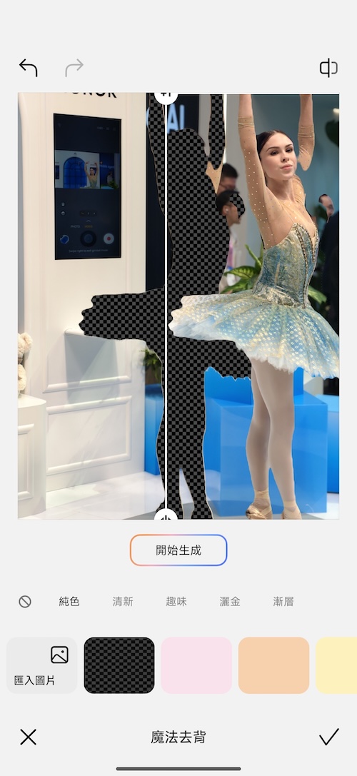 Xiaomi 17 Ultra透過魔法去背功能,可以即時去背並將人物移到照片的任何地方,但目前這功能重新生成還沒有很完善,有時會手腳接不上的情形。