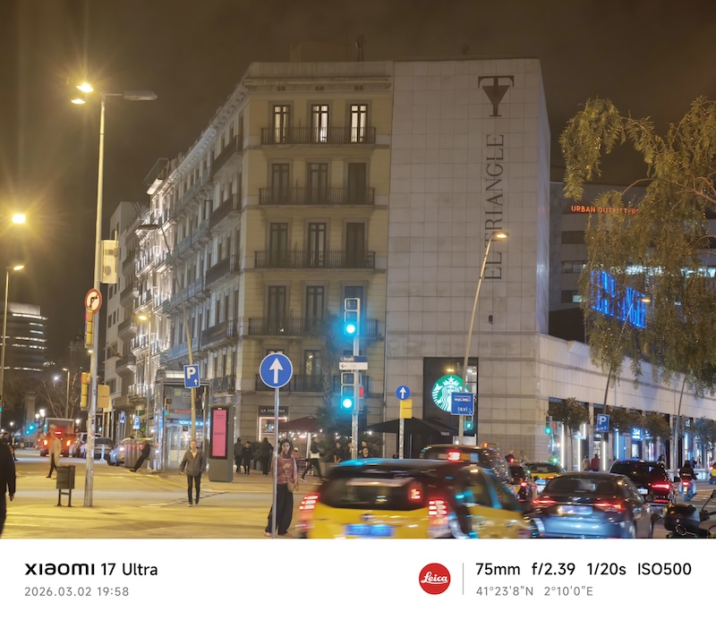 Xiaomi 17 Ultra的夜拍方面,1吋主鏡頭與LOFIC技術帶來相當強的進光量與動態範圍。這項技術的核心目的,可解決手機感光元件在面對「大光比」場景(例如烈日下的強光與深色陰影、夜景中的霓虹燈火)時,高光區域容易呈現一片死白。在夜間城市街拍時,主鏡頭最令人驚艷的是對高光抑制的自然感,得益於LOFIC技術,霓虹燈招牌、路燈或車燈不再是死白一片的過曝光點,而是能清晰看見燈管細節與色彩層次。與傳統手機依賴多幀合成HDR導致畫面看起來像虛假感不同,小米 17 Ultra的夜景更趨向於光學直出的真實感。