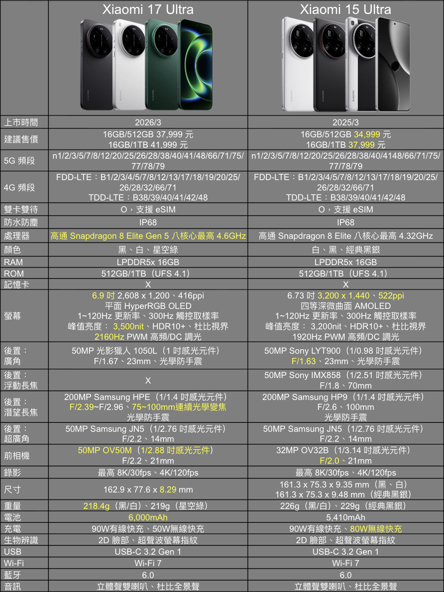 以下是Xiaomi 17 Ultra與前一代Xiaomi 15 Ultra的規格對比(小米跳過16而對標iPhone改為17)。對比Xiaomi 15 Ultra,Xiaomi 17 Ultra主要有三大升級,第一是6.73吋四等深微曲面螢幕改為6.9吋平面螢幕;第二是徠卡四鏡頭改為三鏡頭,原本的70mm與100mm鏡頭,改為一顆100mm的大尺寸75~100連續光學變焦鏡頭;第三是電量的升級,從5,410mAh增加至6,000mAh,加大約11%的電量。至於處理器當然也是常規升級,從原本的Snapdragon 8 Elite升級至今年旗艦主流的Snapdragon 8 Elite Gen 5。
