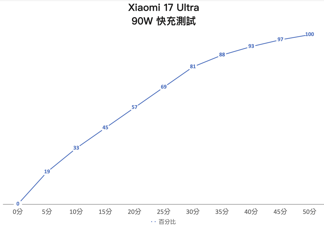 實測Xiaomi 17 Ultra約需49分鐘充滿6,000mAh電量,20分鐘充約57%、30分鐘充約81%。