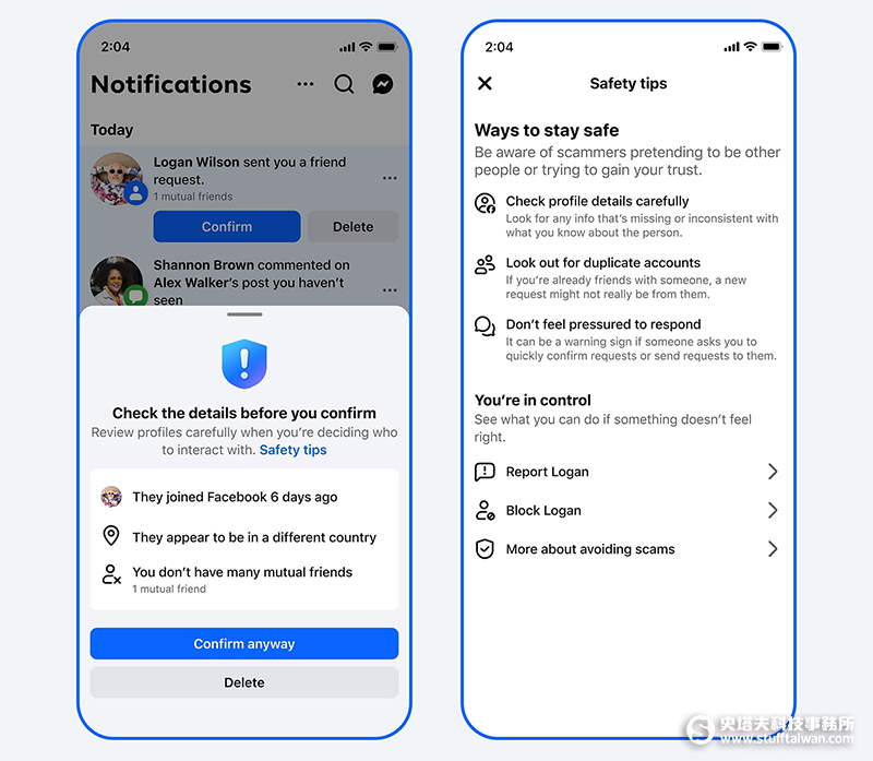 - Facebook 可疑好友邀請警示:Meta 正在 Facebook 上測試辨識可疑帳號的全新功能,當大家發送或收到可疑帳號的請求時,例如:缺乏共同朋友,或其個人檔案顯示的地區與自己的所在地不同時,AI 將會自動警示跳出說明,幫助大家警慎決定是否封鎖或拒絕好友邀請。