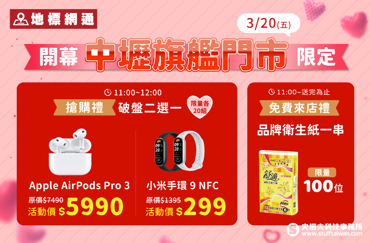 為了慶祝中壢旗艦店的全新出發,地標網通特別在 3 月 20 日當天上午 11:00 至 12:00 舉辦限時一小時的「破盤二選一」搶購活動。其中最受矚目的熱銷冠軍 Apple AirPods Pro 3,原價 7,490 元直接下殺至 5,990 元,相當於市面罕見的 8 折優惠;而小米手環 9 NFC 更是從原價 1,395 元折至僅需 299 元,折扣幅度驚人。此外,地標網通展現寵愛在地鄉親的誠意,開幕當天 11:00 起,前 100 位排隊民眾完全不需消費,即可直接領取「來店禮」限量衛生紙乙串,預計將引發桃園地區的排隊盛況。