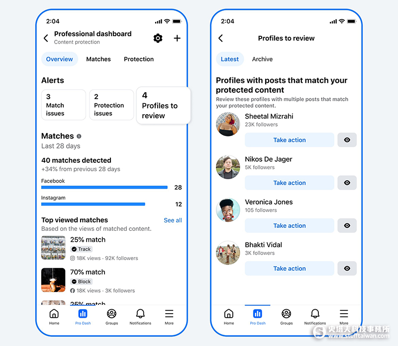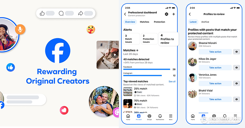 目前,Facebook 也正進階測試此項功能,未來將能偵測潛在冒名行為,讓創作者能在同一介面輕鬆提交檢舉。這些新功能將陸續開放給使用內容保護功能的創作者 。