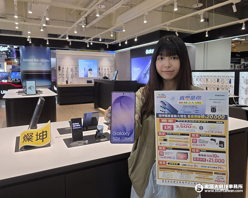 SAMSUNG於上月(26)日發表全新一代的Galaxy S26旗艦手機系列,包含頂規的S26 Ultra、S26+與S26三款新機,並於3月18日正式在台開賣。燦坤同步搶攻新機上市熱潮,即日起至3月31日,只要到全台燦坤門市購買Galaxy S26旗艦手機系列送燦坤獨家「真愛是你 星動AI大禮包」 最高現賺破2萬,詳情可洽燦坤門市。