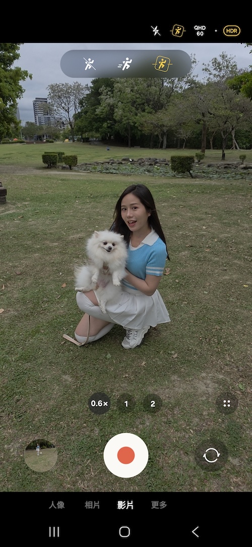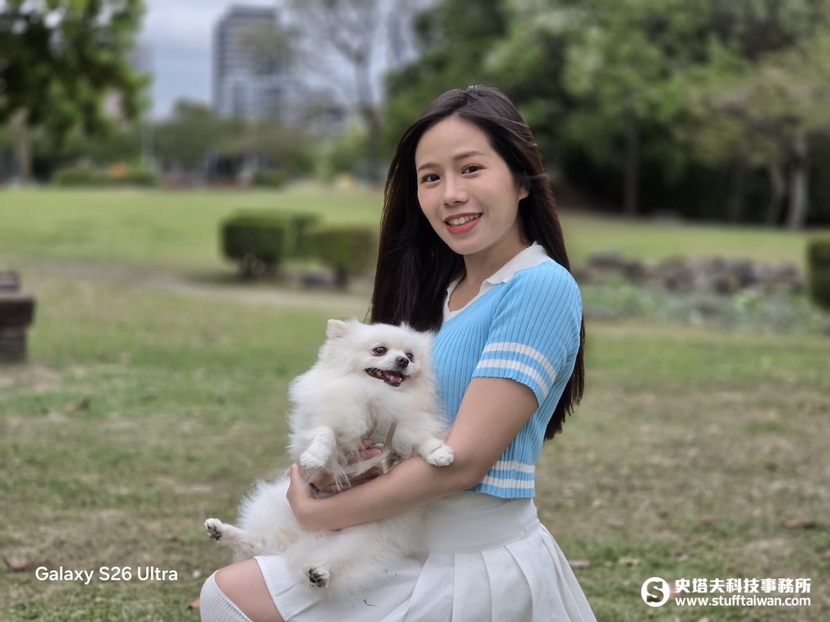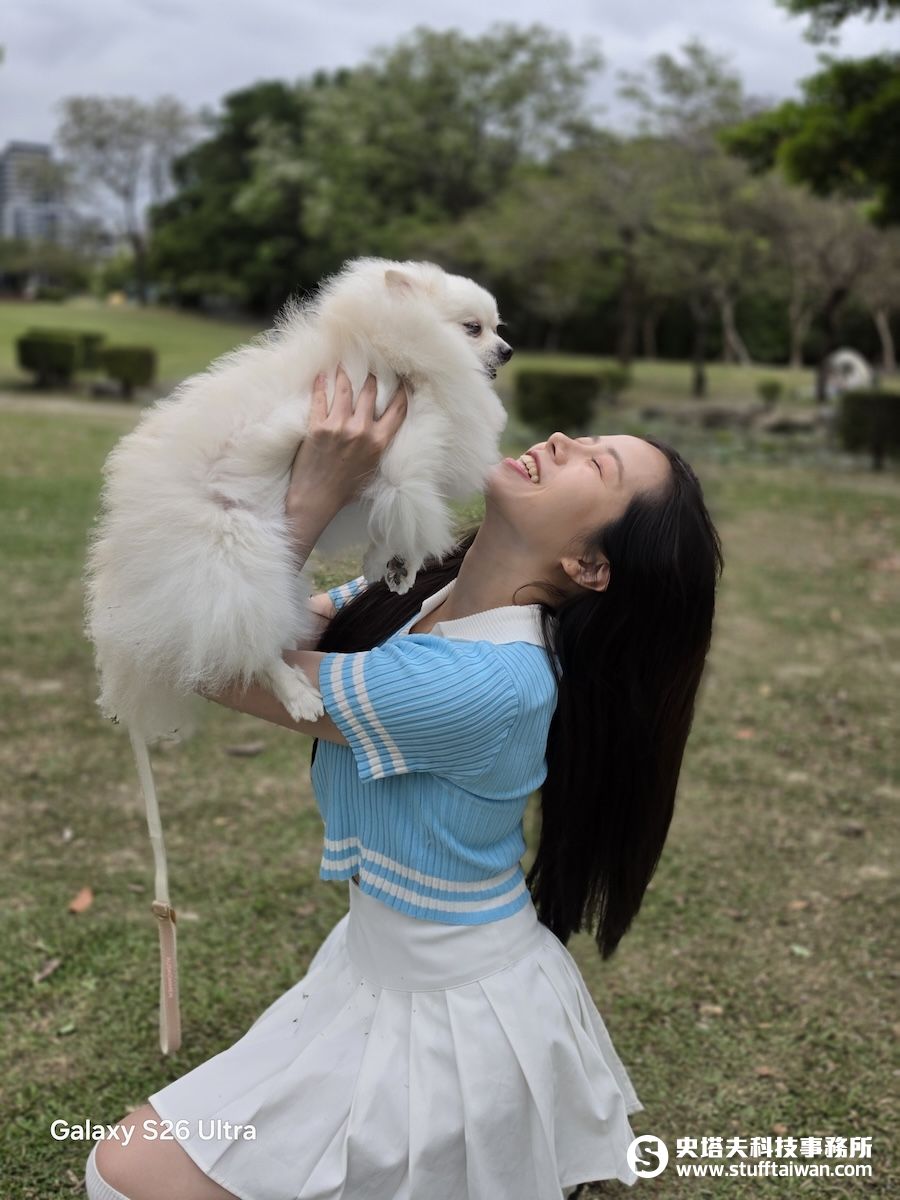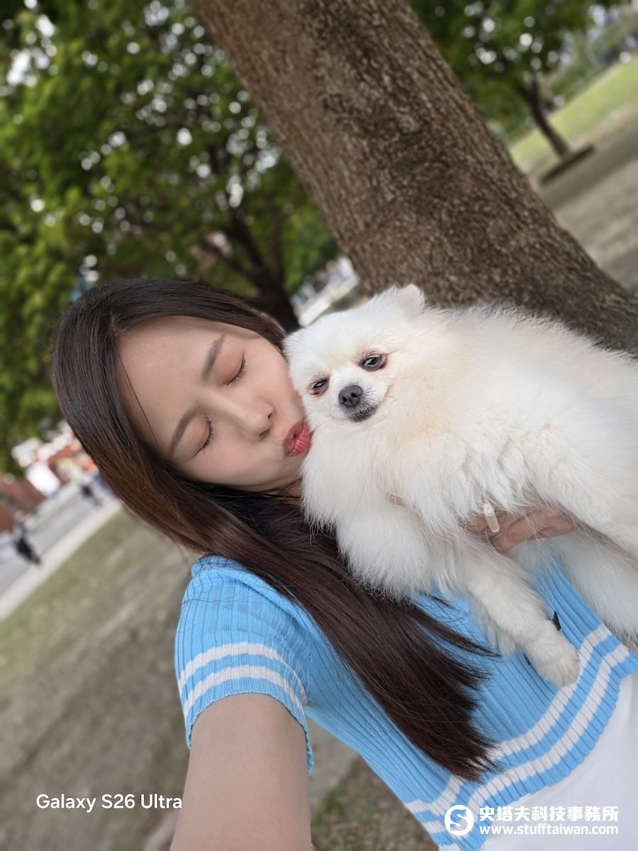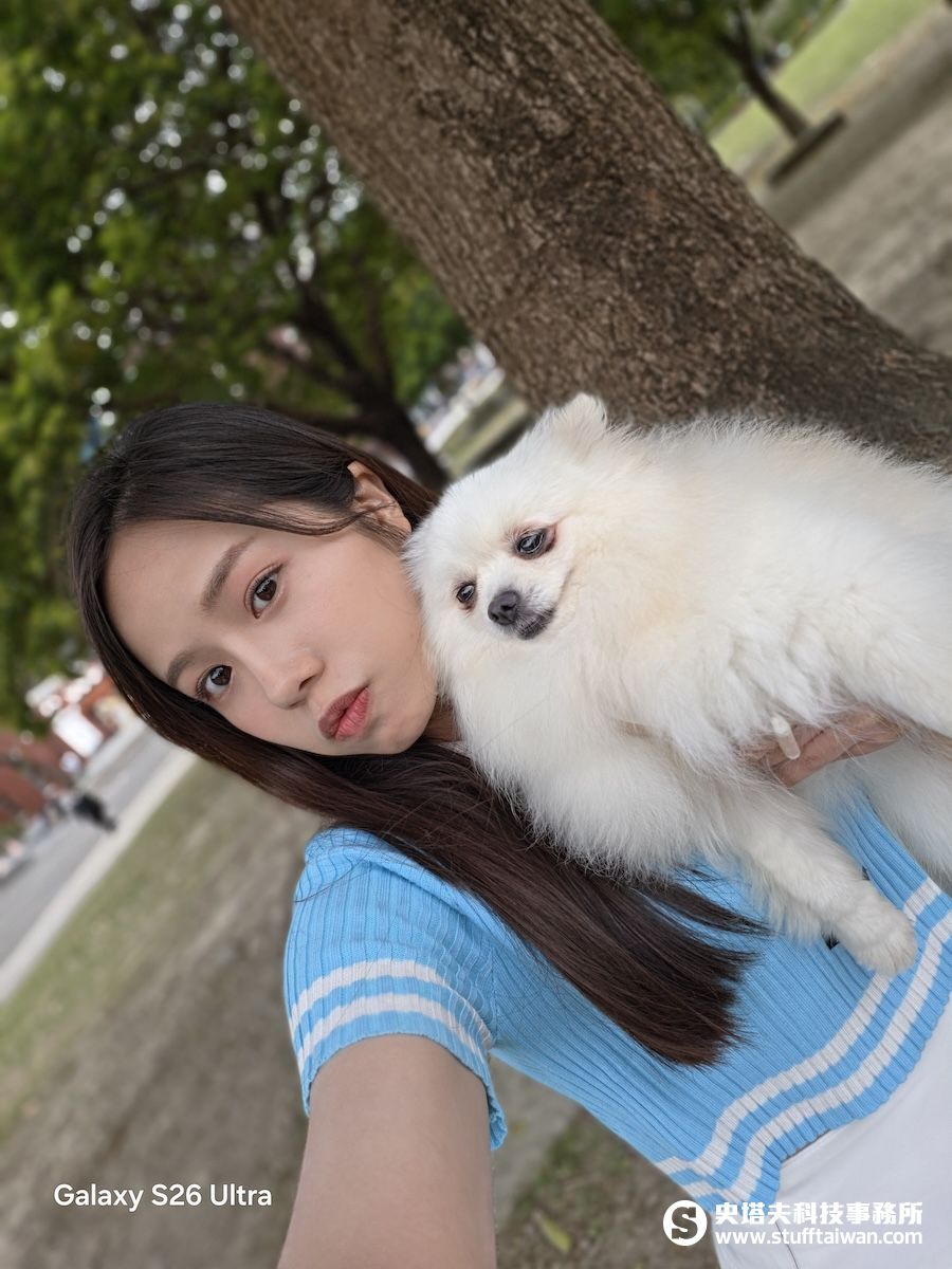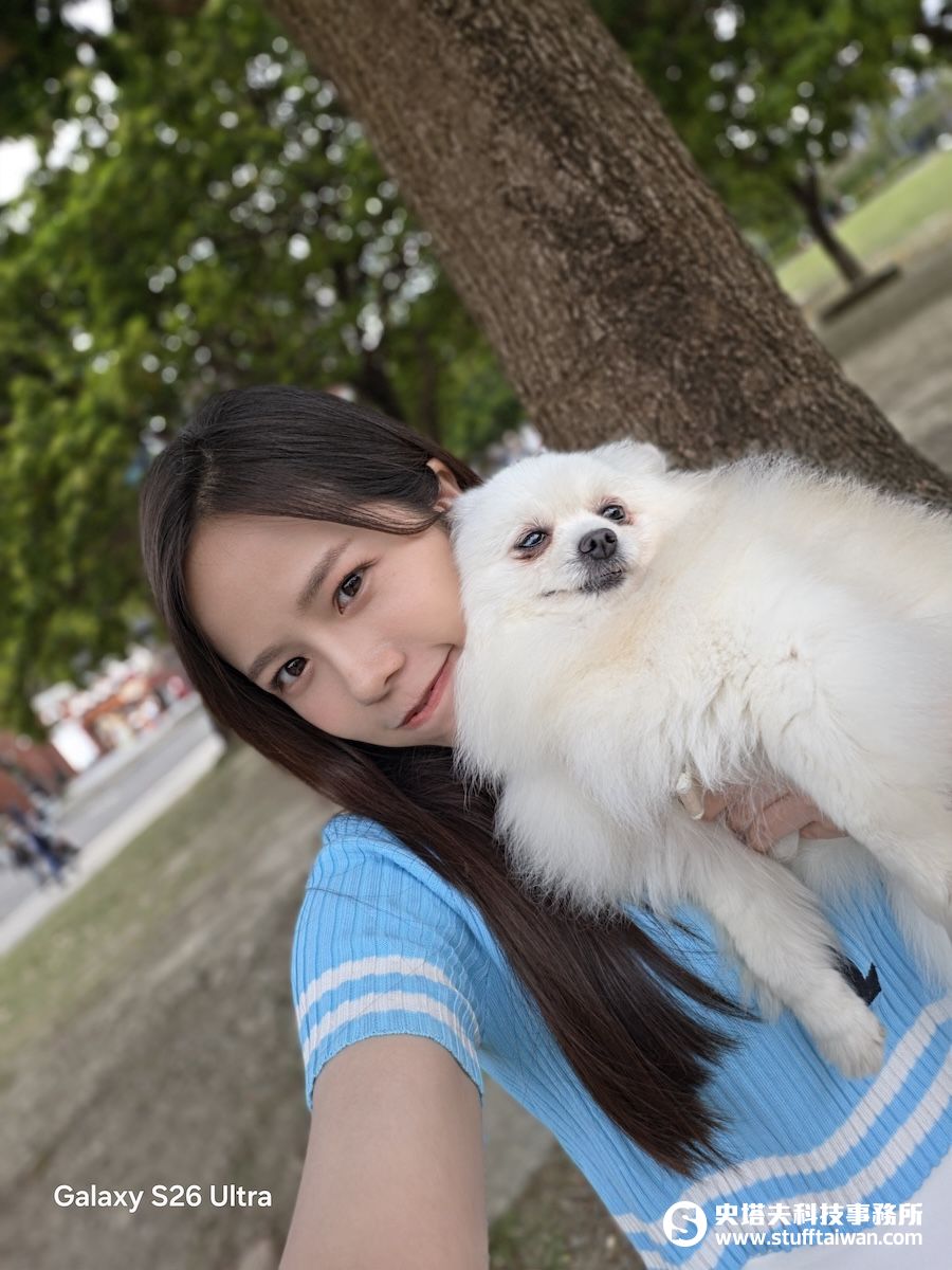 實際使用Galaxy S26 Ultra自拍時,畫面亮度會隨環境自動微調,避免過曝或臉部陰影過重;膚色處理偏向自然校正,而非單一色調覆蓋;細節仍然保留,包括髮絲與輪廓邊緣。在Hami與嚕米的自拍合照中,人物與動物的曝光與色彩被同時最佳化,而不是只針對人臉進行調整,使整體畫面更協調。