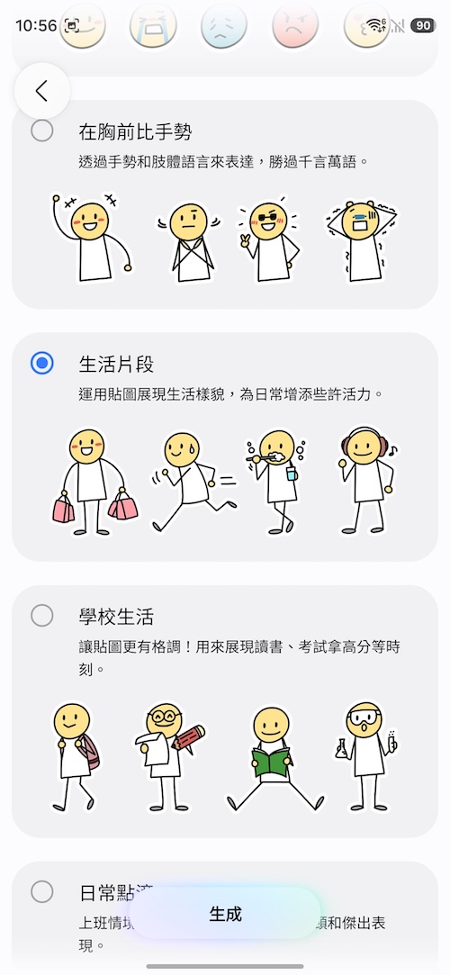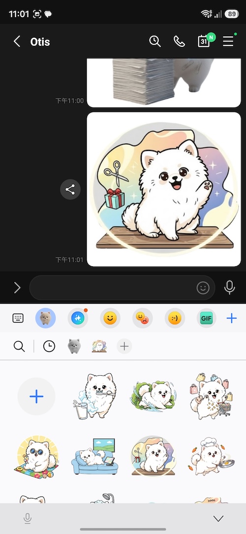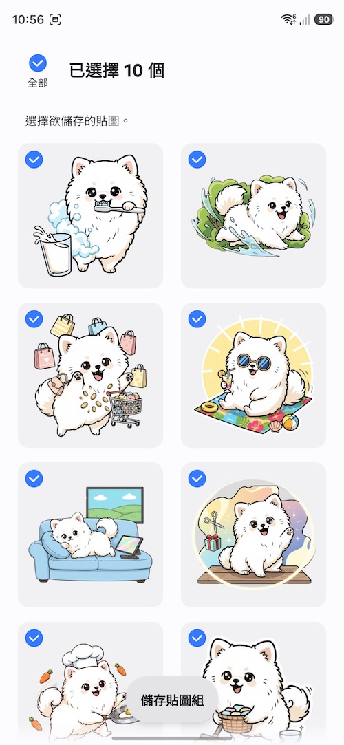 生成的貼圖組會存放在「三星鍵盤」中,使用任何社群軟體與朋友聊天時(LINE、WhatsApp、Messenger、Telegram、簡訊等),在三星鍵盤的左上角即可看到儲存的貼圖組,盡情使用獨一無二的貼圖!