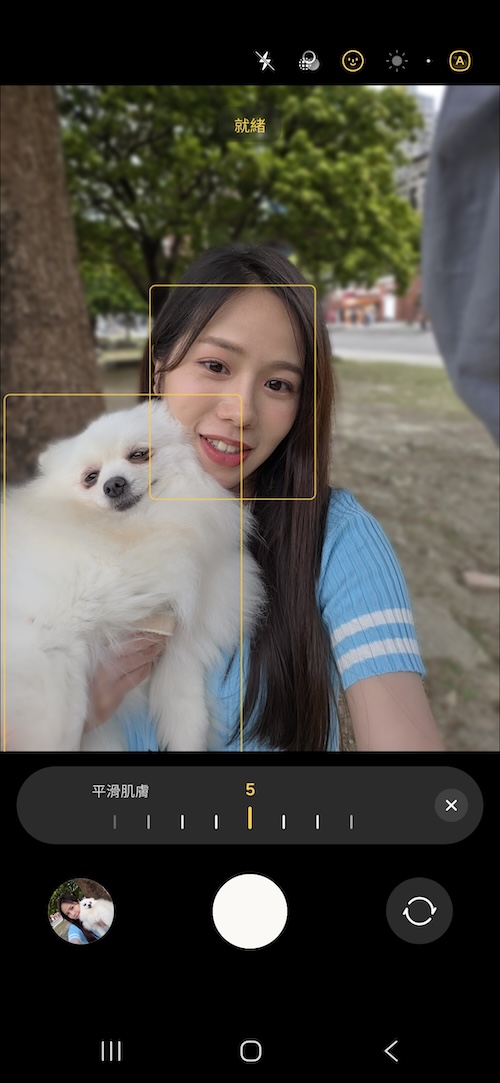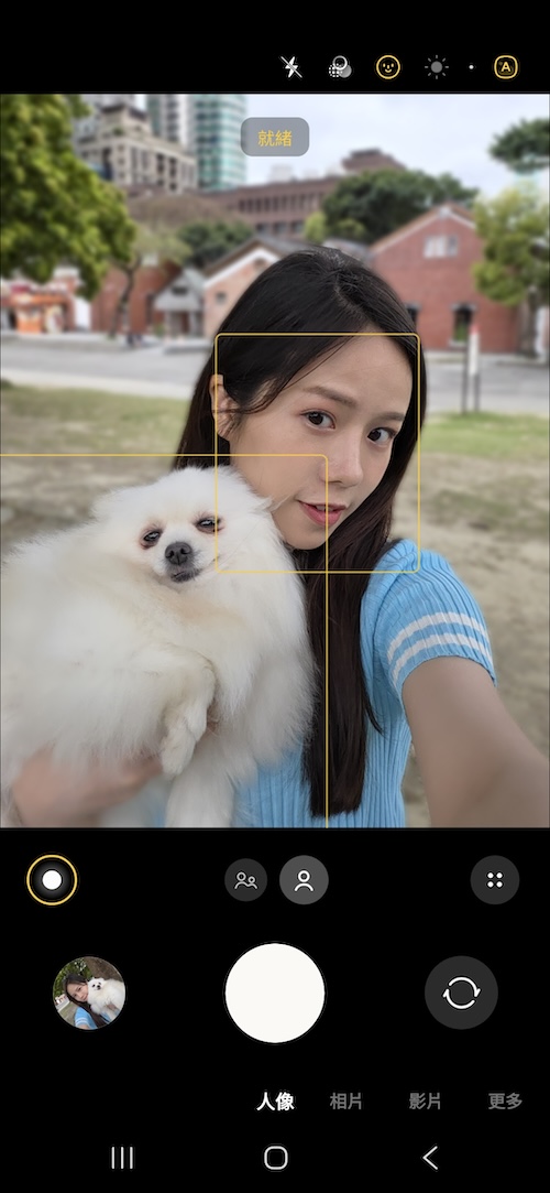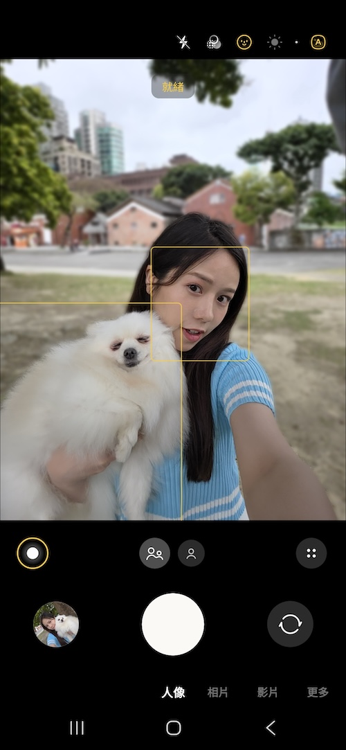 使用Galaxy S26 Ultra前鏡頭拍照時,可切換為廣角模式,自由選擇23mm或30mm。除了對焦人像外,就連嚕米也被黃框偵測同時進行對焦。