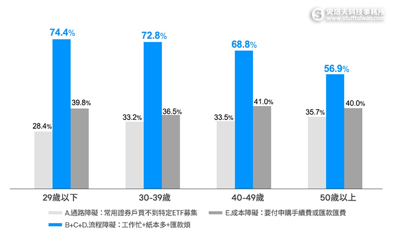 圖一、各年齡層的投資組合中,認為ETF募集申購阻礙原因的比例 (%)