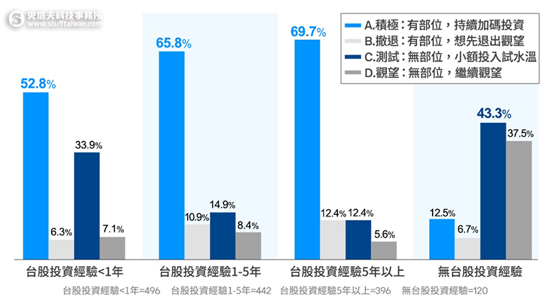 | A. 積極:目前有台股部位,看好大盤後市,持續加碼投資 | 58% |