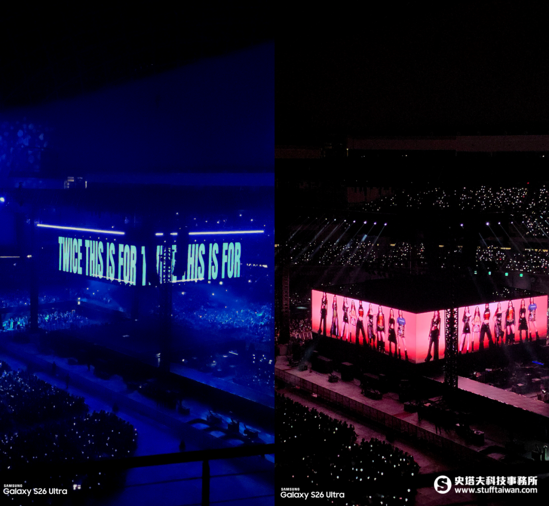 演唱會最美妙也最難拍的地方,就在於那變幻莫測的燈光,一下是全黑只有星光海的抒情歌環節、一下又幻化為動感節奏搭配閃爆全場的雷射光束。手機在低光源下最怕出現「雜訊」及「色彩斷層」。但在TWICE的演唱過程中,Galaxy S26 Ultra的超明亮夜幕攝影則展現了它的夜拍實力。
