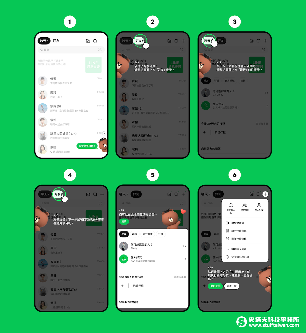 在已經接收到更新發布的用戶裝置中,打開應用程式時將會出現由人氣角色熊大引導的互動說明頁,帶領使用者逐步熟悉改版重點。首要亮點是在聊天頁面中新增了「好友分頁」,讓用戶能直接在對話選單中快速切換至好友名單,徹底省去了過往尋找聯絡人時需在主頁與聊天頁面之間反覆往返的困擾。