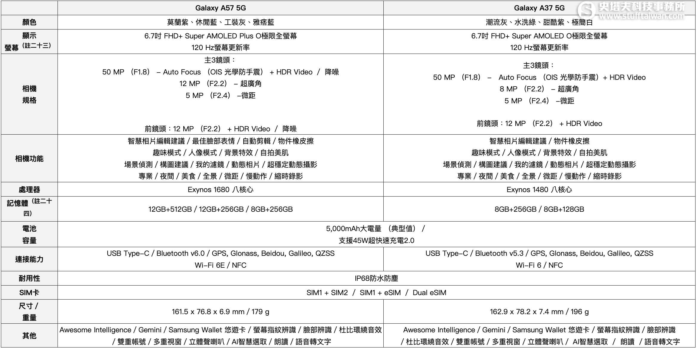 【新聞附件】Samsung Galaxy A57|A37 5G產品規格表