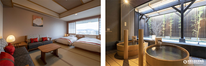 館內設有大浴場與五種風格的私人湯屋,並提供桶浴、岩盤浴與桑拿等多元設施,讓旅客在市區也能享有完整放鬆體驗。餐飲主打京都旬味懷石料理,一樓另設有紀念品商店「花扇」,提供多款京都特色甜點與紀念品,增添旅途儀式感。