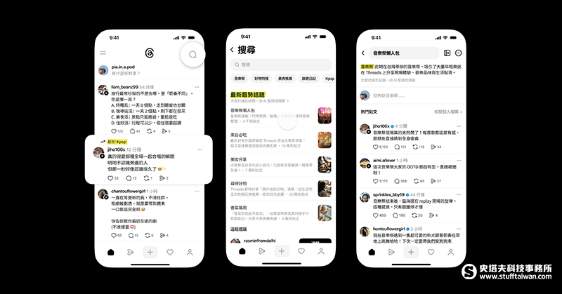 想要一覽即時熱門話題,只要在主畫面點擊右上角的「搜尋」,即可瀏覽各大熱門話題的完整清單;或者在動態牆上,若看到特定串文上方有「超夯」標籤,即代表此篇串文與「趨勢話題」相關,點擊標籤或主題後,系統將直接引導大家至該「趨勢話題」的相關內容,輕鬆探索相關內容並加入對話。