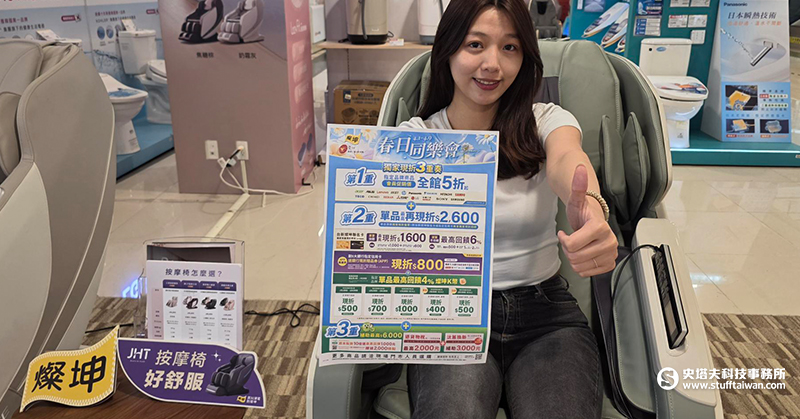 並可搭配節能補助與汰舊換新方案,最高回饋6,000元,再享全館單筆消費滿4,455元(排除購買Apple、小米系列與Switch 2主機商品,且須事先綁定「TK3C」APP,並於5月11日前出庫),就有機會抽中iQOO 15 電競智慧型手機(市值29,999元,抽1名)、JHT超好窩沙發按摩椅(市值29,800元,抽1名),讓消費者到燦坤買得物超所值,心花開好運開。