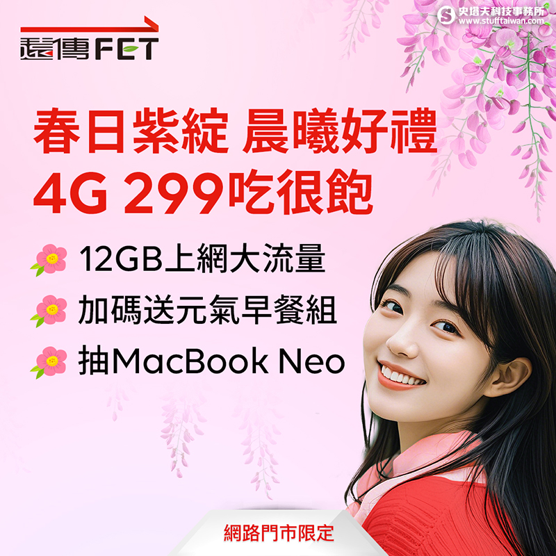 迎接春暖花開的季節,遠傳網路門市推出4月限定「春日幸福加碼」活動,新申辦與攜碼申辦299元起資費,即可享超商早餐組兌換券與最高3,000遠傳幣回饋,並可參加最新MacBook Neo抽獎;此外,手機、3C商品到Apple熱銷商品也同步推出加碼優惠。遠傳也提供續約用戶多項升級選擇,還可參加999玩樂金抽獎,讓不同需求的用戶都能輕鬆更新數位設備。