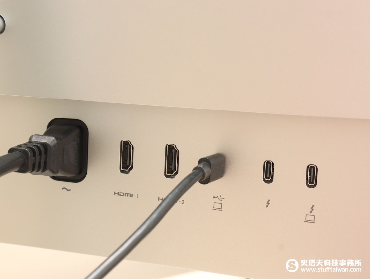 BenQ MA320UG不只是一台顯示器,更像是一個多裝置的中央指揮中心。其強大的Daisy Chain菊鍊串接能力,這讓搭載Apple Silicon Pro、Max或Ultra晶片的機型可以透過螢幕直接串聯,最高支援雙5K螢幕的極限組合,但我用的是Apple M1與M2晶片的MacBook無法使用。內建的智慧型KVM切換器讓MacBook與Mac Studio宛如一體,只需一組鍵盤滑鼠即可實現雙系統無縫操控。