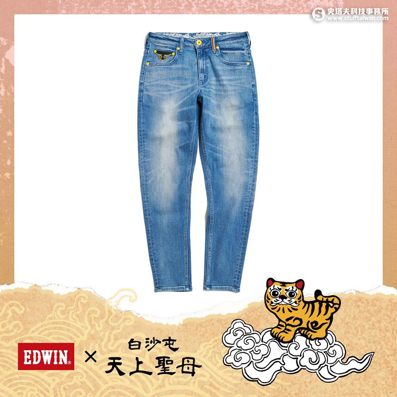 除金飾外,還有EDWIN男裝 白沙屯 媽祖雙色袋花結緣錐形褲,透過刺繡工藝、版型設計與視覺元素,將信仰轉化為日常穿搭風格。即日起至4/29享EDWIN 長褲2件折1,200元。