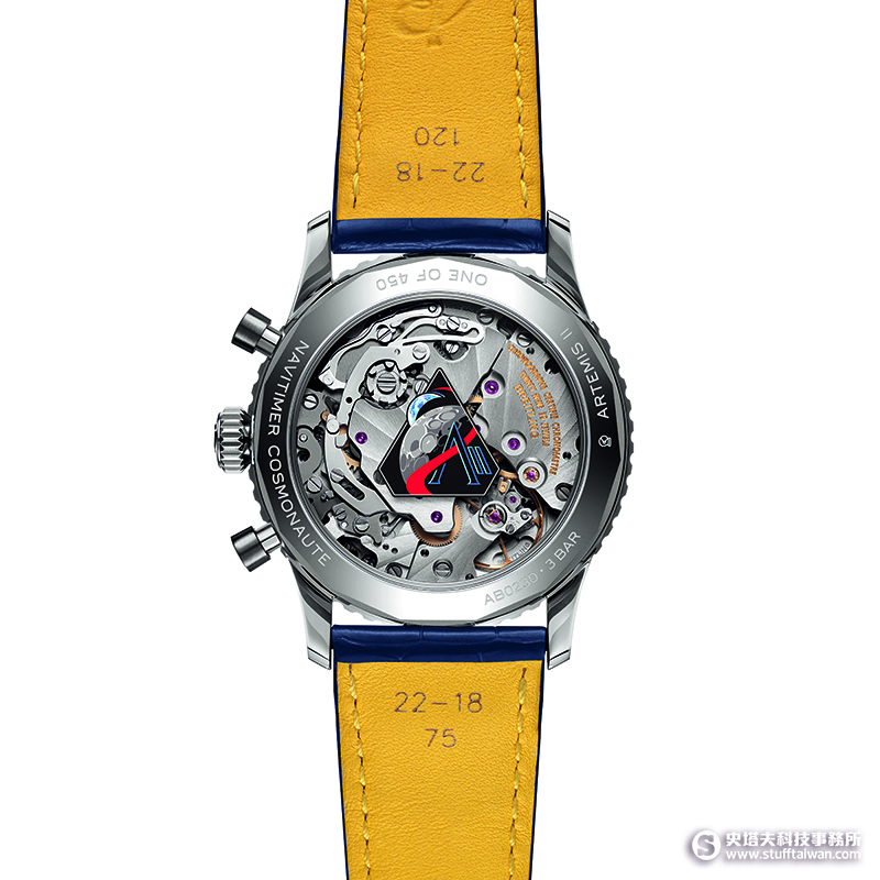 全新限量腕錶致敬Scott Carpenter的歷史性飛行,同時展望太空探索的未來,全球限量450枚,搭載手動上鍊的百年靈自製B02型機芯,並採用由外太空隕石切割而成的銀河藍錶盤。這種隕石主要由鐵與鎳組成,經蝕刻後展現天然交錯的魏德曼花紋,令每一枚錶盤皆為獨一無二。錶殼刻有「Artemis II」與「One of 450」字樣,向當代太空任務致敬,開放式底蓋上,印有Artemis II的任務標誌。