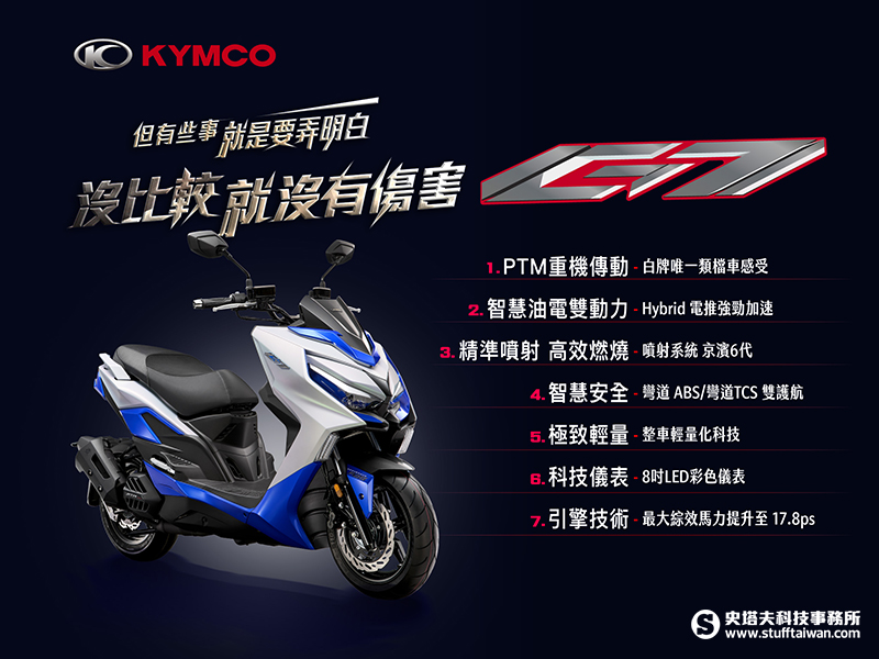 - 「G7價格與規格」將於 4 月 18 日公告,並於 4 月 20 日起開放預購接單,最新消息與產品資訊請關注 KYMCO 官方網站。