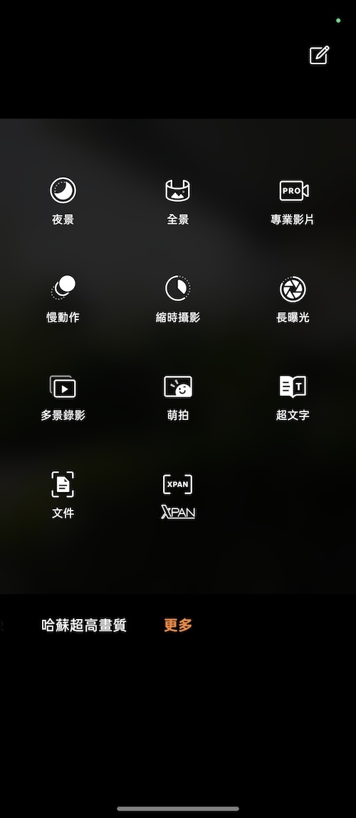 Find N在更多中,還有夜景、全景、專業錄影、慢動作錄影、縮時攝影、長曝光、多景錄影、萌拍、超文字、文件、XPAN模式,可以新增到下方的相機選單。