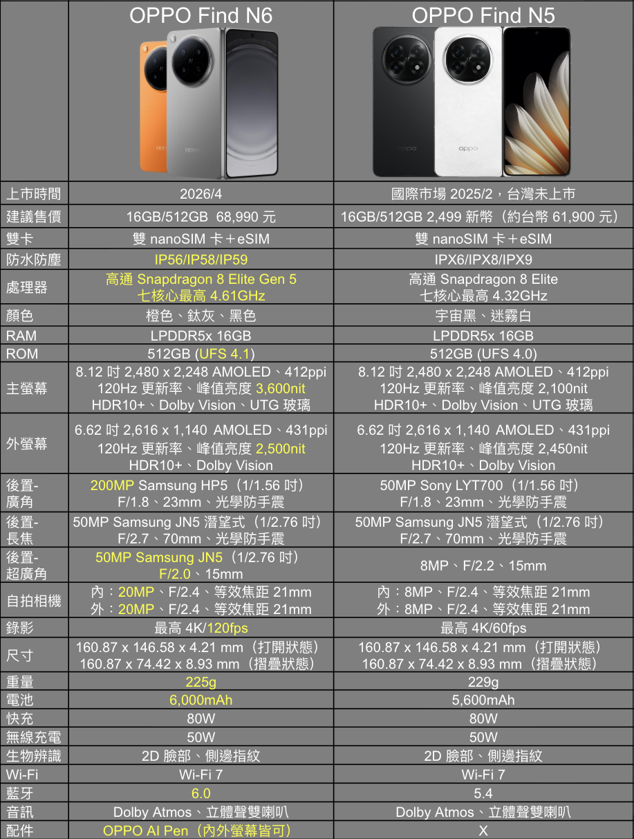 以下是Find N6與Find N5的規格比較,Find N6主要有以下升級: