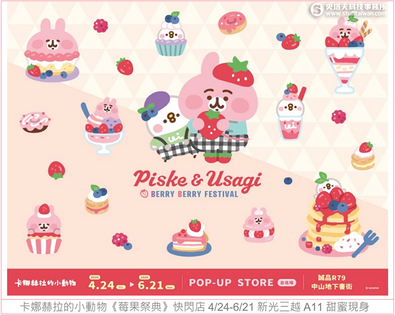 抓住草莓季的尾巴, P助與粉紅兔兔帶來今夏最盛大的莓果祭典啦!卡娜赫拉的小動物《莓果祭典》快閃店4/24-6/21台北誠品R79甜蜜現身,現場打造五大超甜打卡點一定要拍好拍滿!