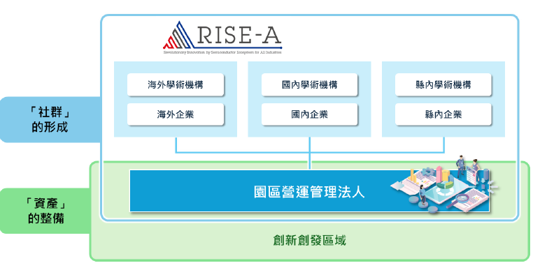 三井不動產將與熊本縣共同設立管理法人公司,負責園區的營運管理與資源對接。該法人將結合 RISE-A 的網絡資源,建構連結日本國內外的產官學合作社群,藉此創造資訊交換與跨域協作的機會。此外,園區將設立「創新中心(Innovation Center)」,針對特定研發主題提供實務支援,特別是在目前備受關注的半導體後段製程領域,將推動企業與學術界之間的深度協作,強化前段製程與後段製程產業間的連結視角。