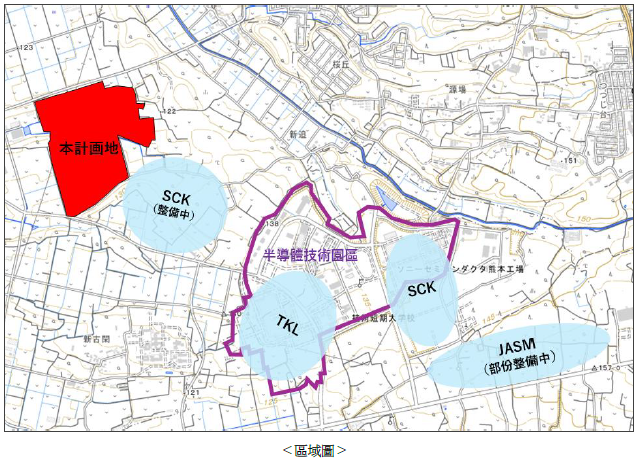 本計畫選址於日本半導體重鎮,鄰近 JASM(台積電與索尼等合資公司)、東京威力科創九州(TKL)及 Sony 半導體製造(SCK)等指標性企業聚集地。地理位置極具競爭力,距離中九州橫斷道路合志交流道僅約 2 公里,且緊鄰正規劃興建機場鐵道的阿蘇熊本機場。優越的廣域交通可及性,不僅有利於物流運輸與工程師往來,更能與周邊現有的產業聚落形成強大的加乘效應,鞏固其作為九州產業核心的地位。