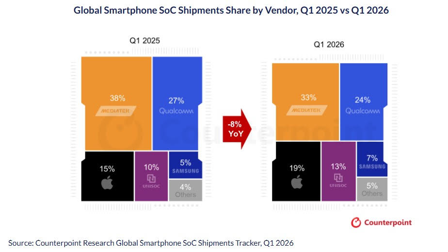 根據 Counterpoint Research 最新發佈的全球智慧型手機 SoC 出貨量初步預測報告顯示,2026 年第一季全球手機處理器出貨量較去年同期下滑 8%。這一波動主要歸因於持續延燒的記憶體供應短缺危機,不僅影響了手機原廠(OEM)的成本結構,也阻礙了晶片供應商的新產品開發計畫,迫使各家企業必須重新優化其產品組合。