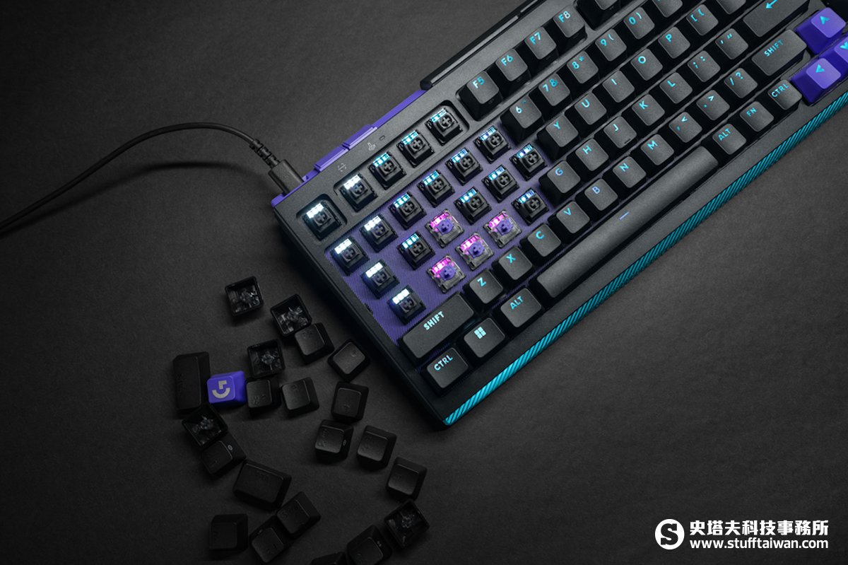 為了賦予虛擬操作更真實的觸覺回饋,G512 X 在底座隱藏收納空間內置了 5 顆專屬 SAPP 二段按壓觸發點橡膠環。透過特殊的物理回彈設計,玩家在按壓類比軸時能獲得明確的斷落感,清晰感受第二段指令觸發的瞬間。此外,羅技展現了令人驚嘆的工業設計巧思,將專業的拔鍵器與拔軸器巧妙轉化為鍵盤的 8° 支撐腳架,這項設計不僅節省空間,更讓玩家隨時隨地都能進行軸體改裝,滿足對最強戰備的無限渴望。