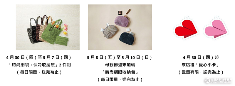 - 5月8日(五)至5月10日(日)母親節週末期間加碼,單筆消費滿NT$1,500,則可獲得「時尚網眼收納包」。(每日限量,送完為止)