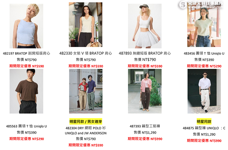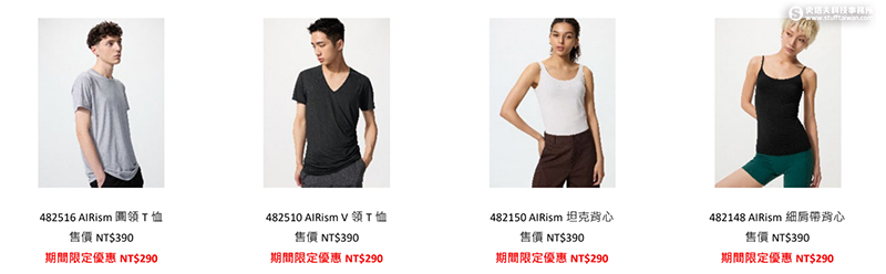 大師設計UNIQLO and JW ANDERSON 男女適穿DRY網眼POLO衫期間限定優惠NT$590、舒適不悶熱AIRism涼感內搭單品期間限定優惠NT$290等。